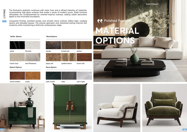 - Material directions including brushed stone, polished wood, tactile cement, and rich textiles.